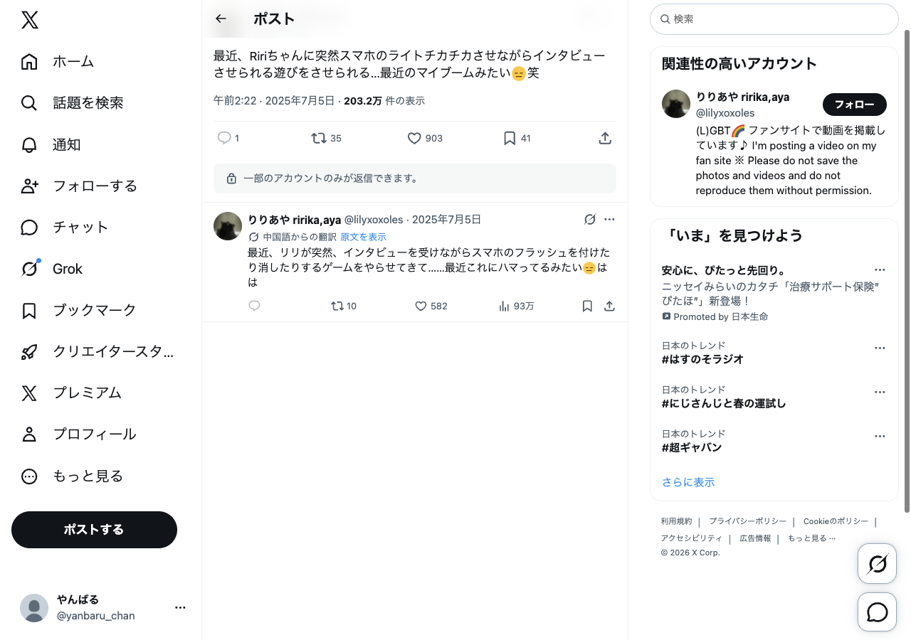 最近、リリが突然、インタビューを受けながらスマホのフラッシュを付けたり消したりするゲームをやらせてきて……最近これにハマってるみたいはは